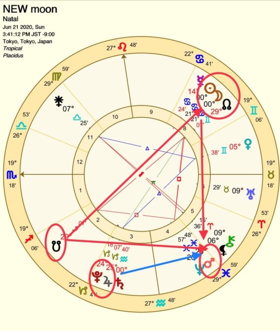 蟹座新月(太陽&月)は、火星、海王星、土星によって、がんじがらめになって身動きがとれません。