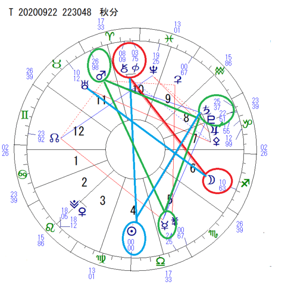 2020年の秋分を表す天秤座太陽は4ハウスで起こり、8ハウス山羊座土星とトライン