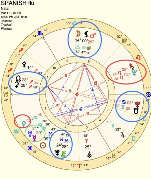 スペイン風の蔓延度と天体の度数からして、3月中旬とか下旬あたりのような感じはしますが