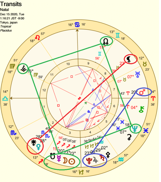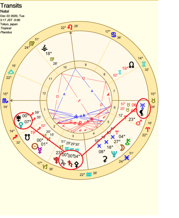 射手座日蝕と共に、自分の基盤や足元を見直す必要が出てきます。(青色の丸と線)