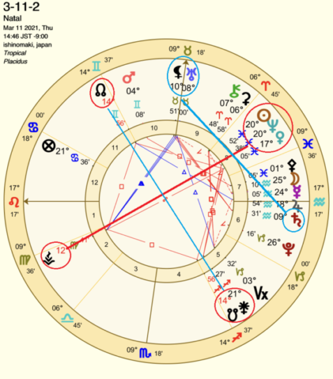 下記は、2011/3/11 14:46の東日本大震災時のホロスコープです。