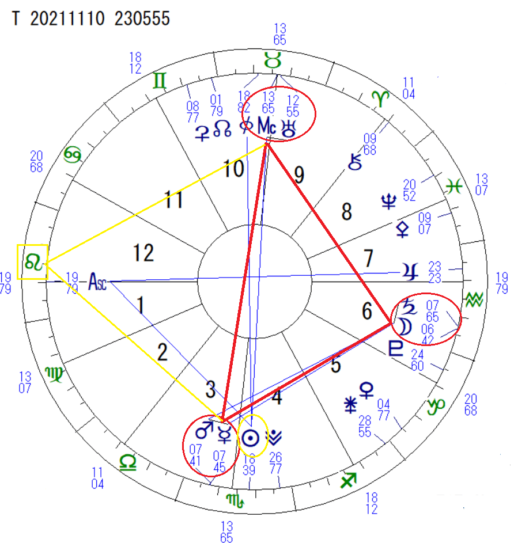 不動サインによるTスクエアの補完としての蠍座的目標は(黄色の四角と線)