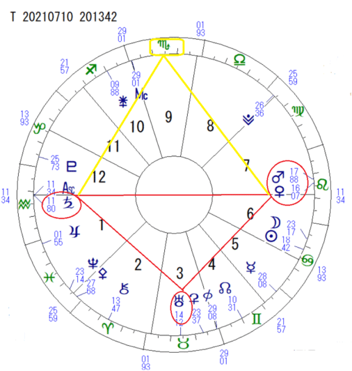 7/4日以降、牡牛座天王星を含んだTスクエアを形成しました。(赤い〇と線)