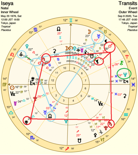 このネイタルチャートの T スクエアに対して、トランジットの牡牛座天王星が重なりますから