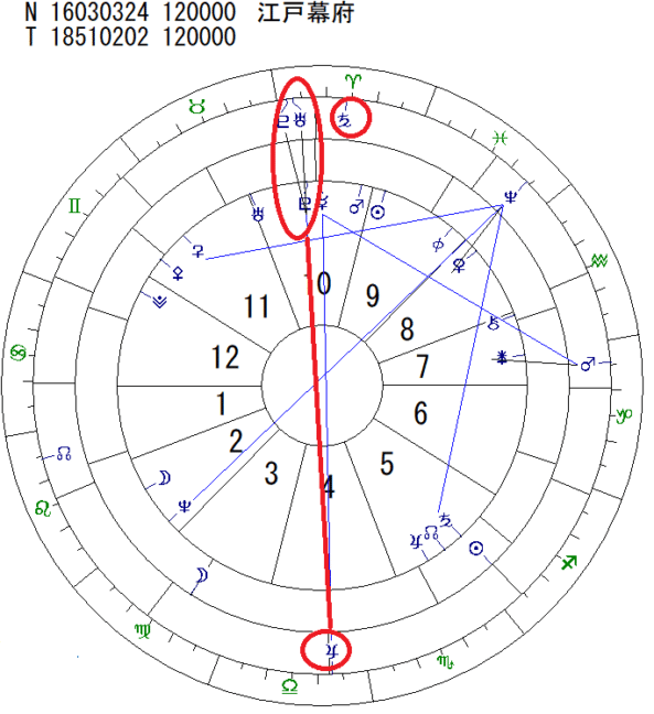 江戸幕府や将軍を意味する太陽は牡羊座3°、破壊と再生を意味する冥王星は牡羊座25°
