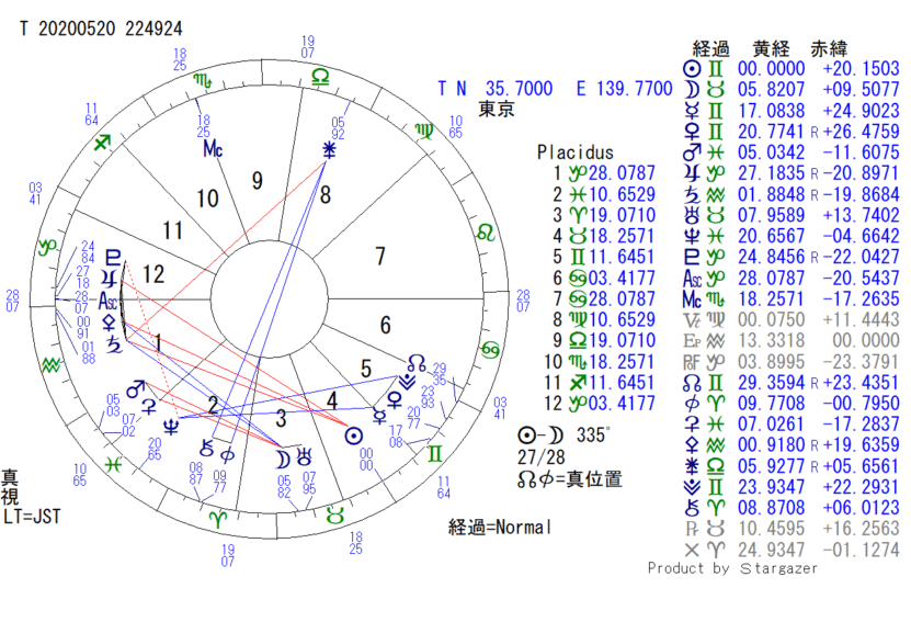 1ハウス(アセンダント)付近には逆行中の冥王星、木星、土星がいて、双子座太陽とトライン