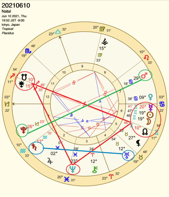 6/14日は、双子座太陽と魚座の海王星が23°でタイトなスクエアを作ります。